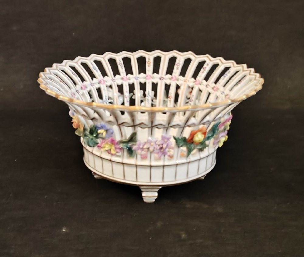 DRESDEN porcelain fruit basket with openwork and encrusted flowers, 20cm