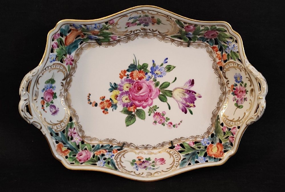 DRESDEN porcelain bread dish with hand painted flowers, 29cm