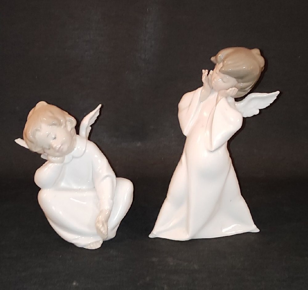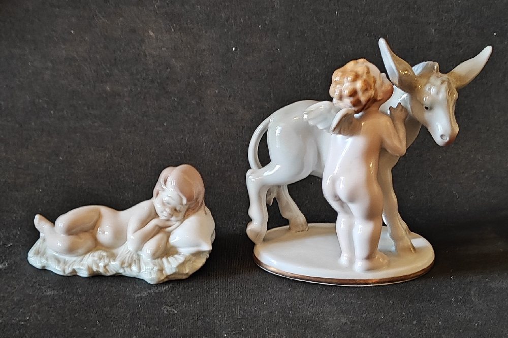 LLADRO porcelain crib bambino, 10.5cm; and NEUTETTAU porcelain cherub with donkey, 11cm