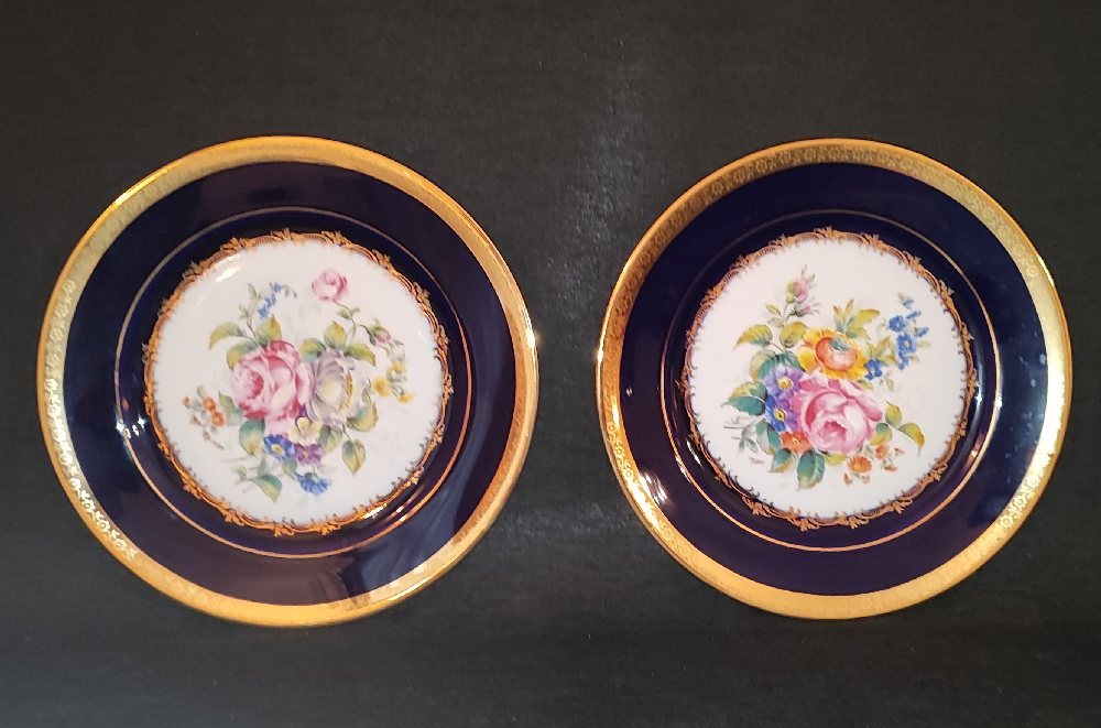 2, LIMOGES porcelain cobalt blue plates, with hand painted flowers and 22ct gold, 21cm