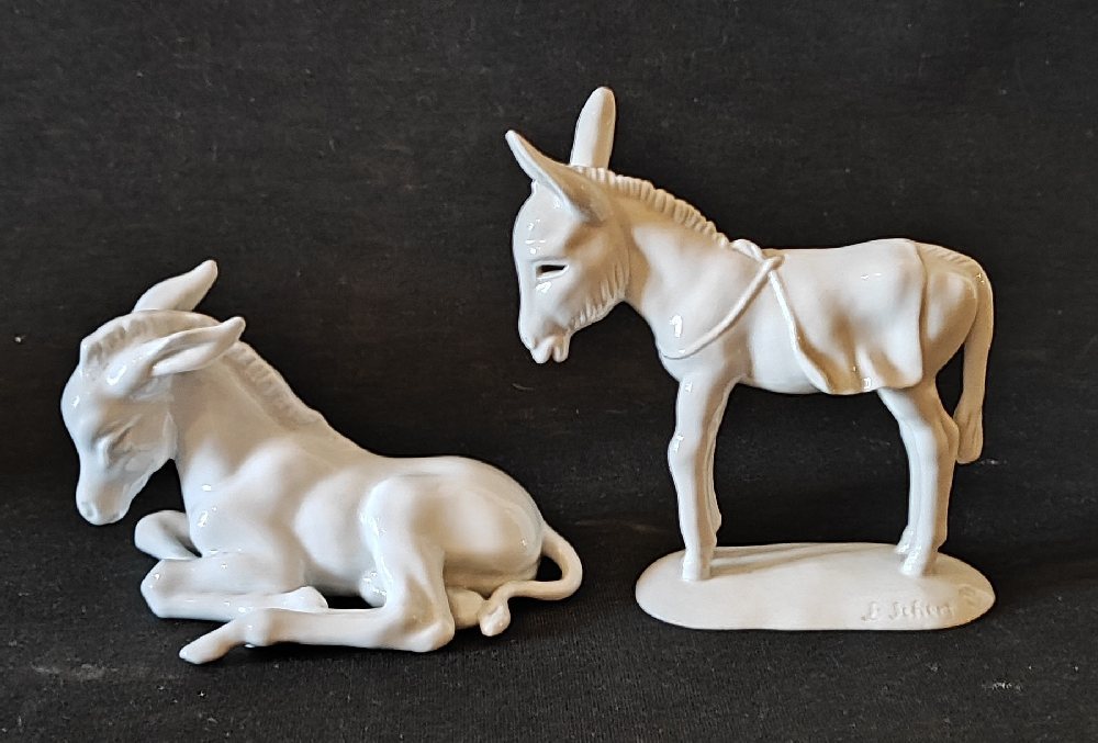 ROSENTHAL blanc de chine porcelain donkey, 14cm; and NYMPHENBERG porcelain donkey by L Scherr, 12cm