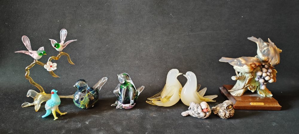 2, China small birds; glass birds on a branch, 2 glass birds and 2 others; plate; G Armani birds on wood base