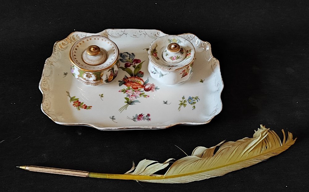 Early 20th C. porcelain standish with hand painted flowers
