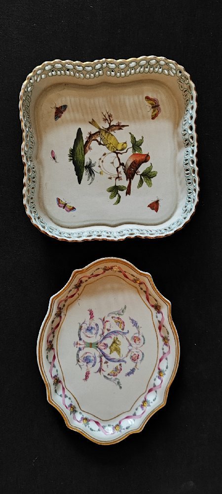 R GINORI porcelain oval dish with hand painted flowers; Hungarian porcelain square dish painted with birds