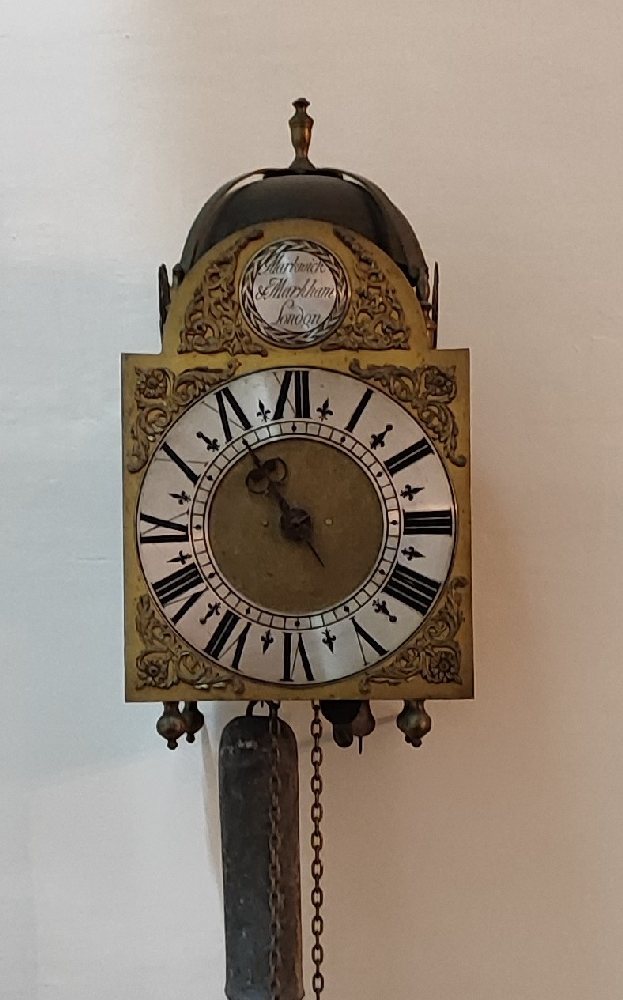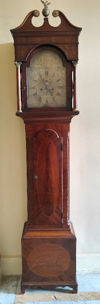 19th C. Long case clock by T Hurley, Bedminster, engraved steel dial, in mahogany inlaid case