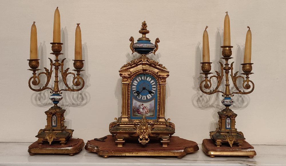 Mid 19th C. French ormolu 3-piece clock set with blue porcelain, on gilted bases