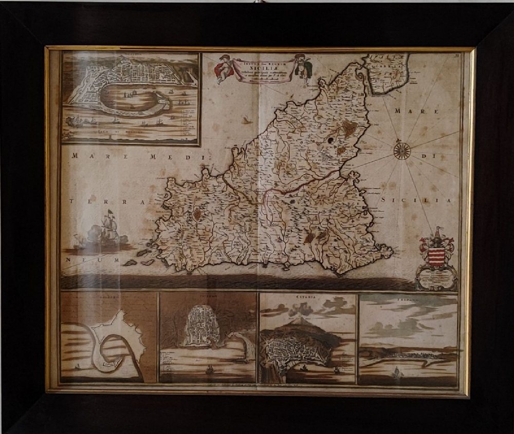FEDRICO DE WIT, (1629-1706) 18th C. Print ‘Insula Regnum Sicilae’ paper stained, framed