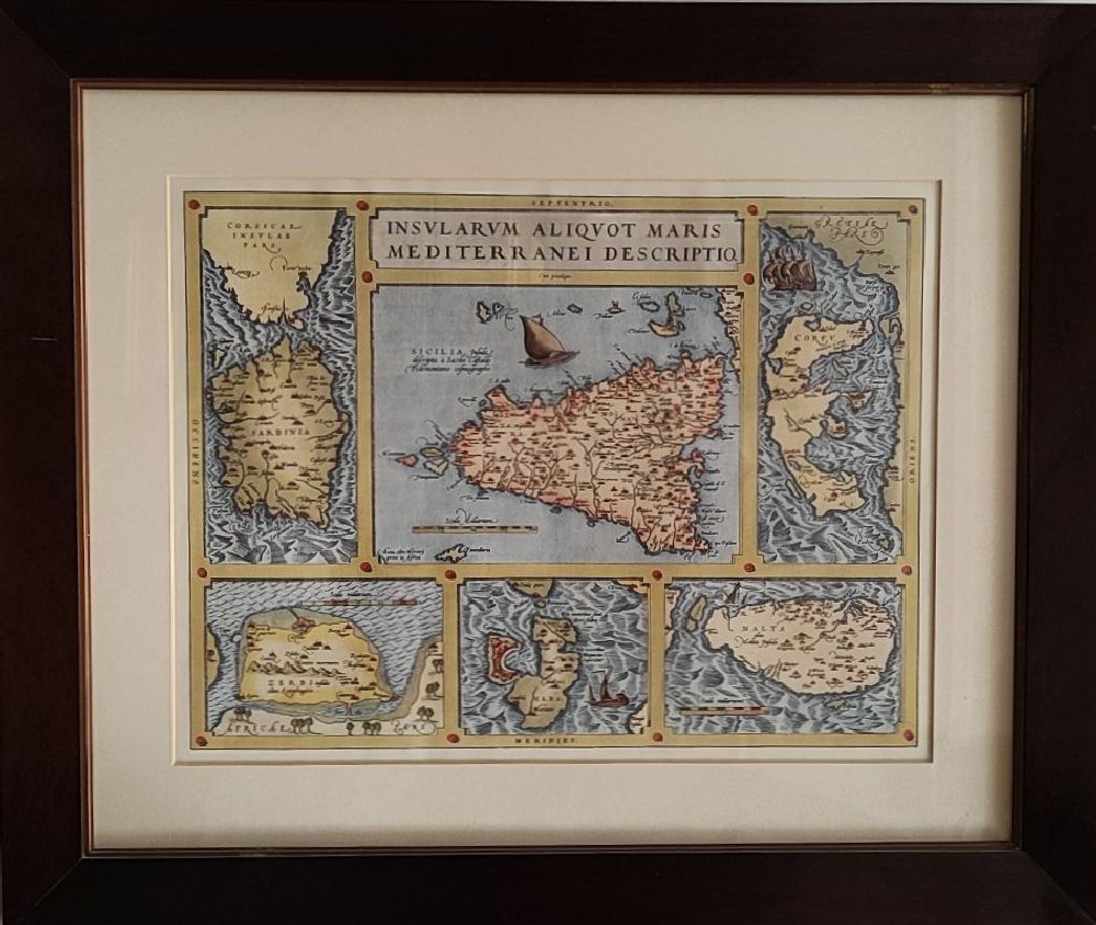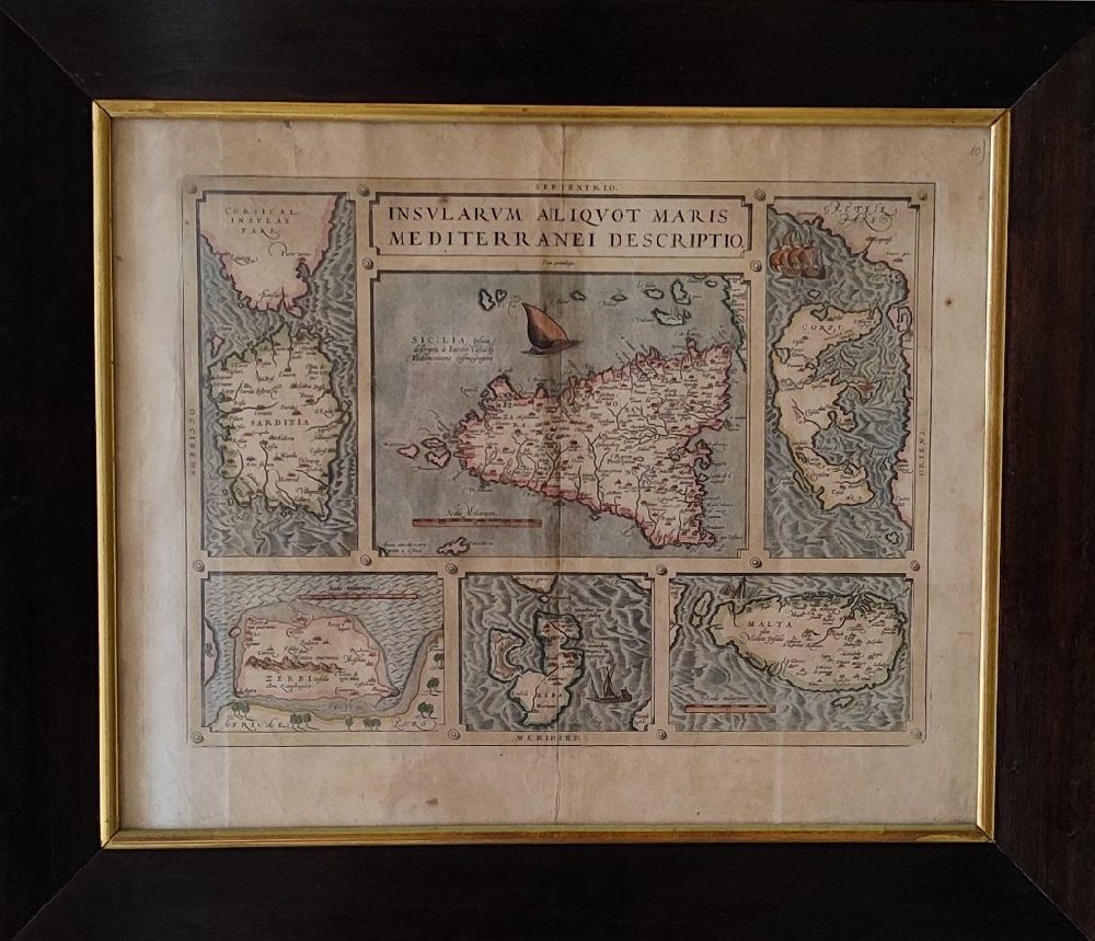 ABRAHAM ORTELIUS (1527-1598) Print ‘Insularum Aliquot Maris Mediterranei Descriptio’ Sicily, Malta, Sardinia, Elba, Corfu, with water colour, framed