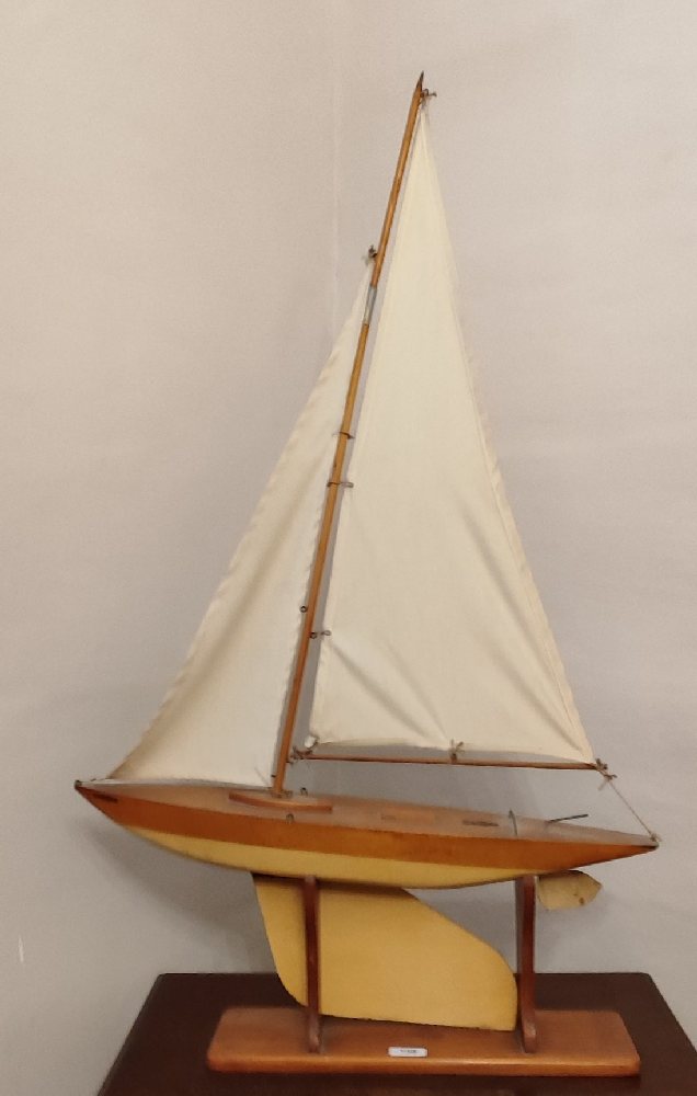 Wood scale model of a sail boat: Bowman, 61cm long, on stand