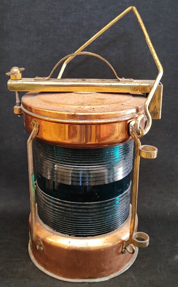 20th C. ships navigation lantern with green Fresnel lens