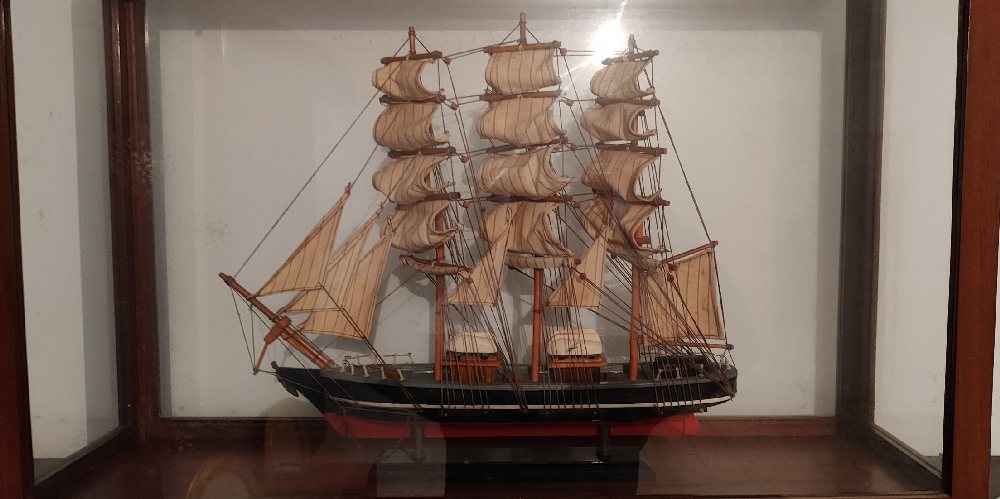 Polychrome decorated scale model of a 3-mast schooner, in glass and mahogany case