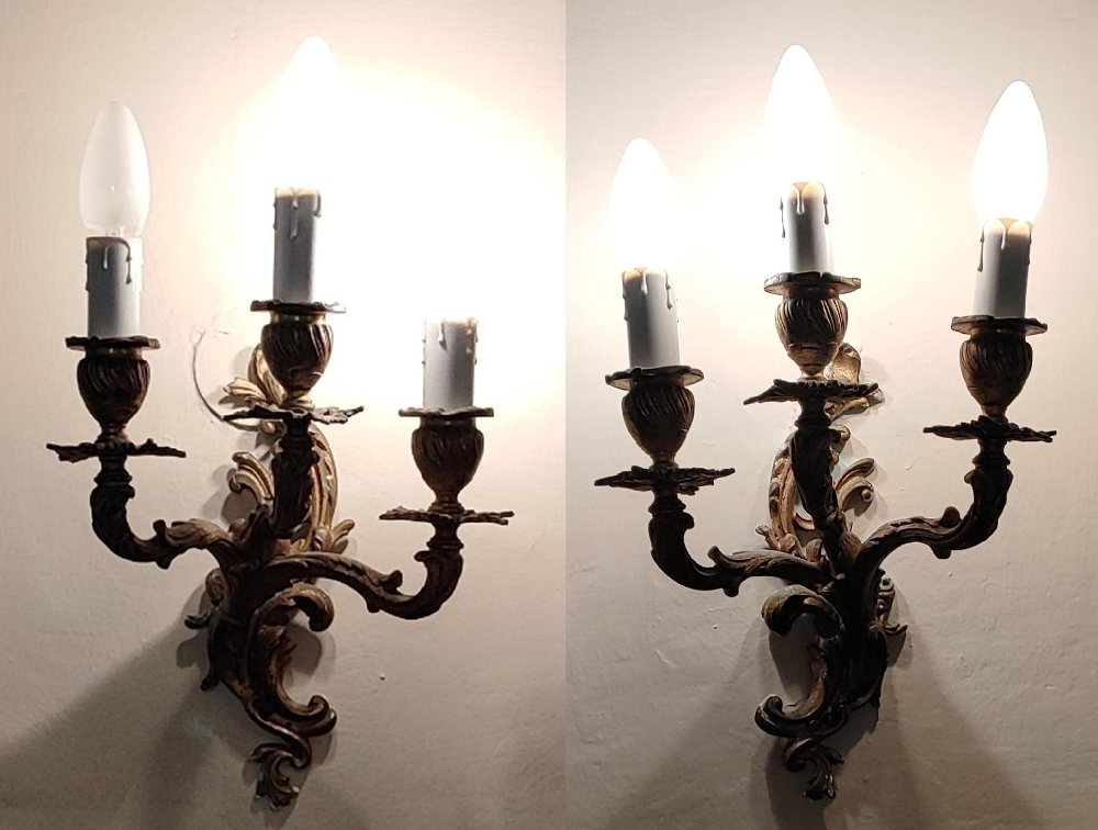4, French early 20th C. brass wall lights x 3 candleholders in the Louis XV style, 38cm (window)