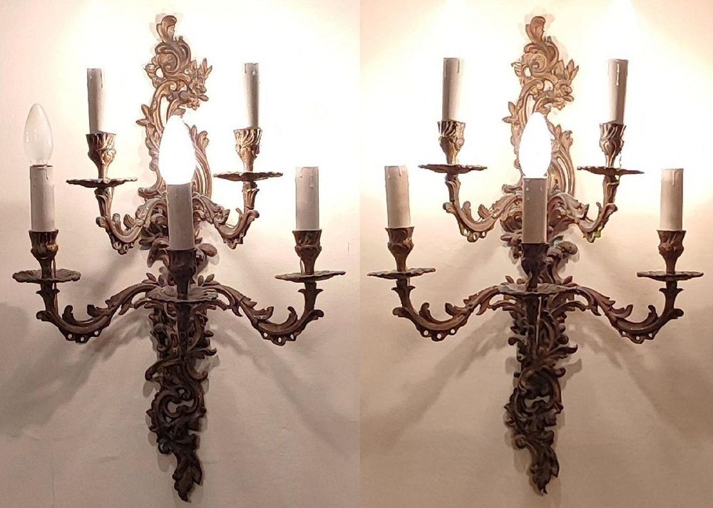 2, French early 20th C. brass wall lights x 5 candleholders in the Louis XV style, 60cm (fireplace)