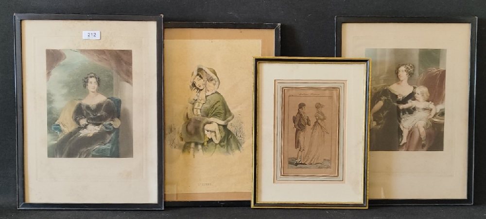 2, Late 19th C. Steel plate prints ‘Portraits’, framed; 2, Late 19th C. Prints ‘Hiver’ and Costum Parisienne’, framed