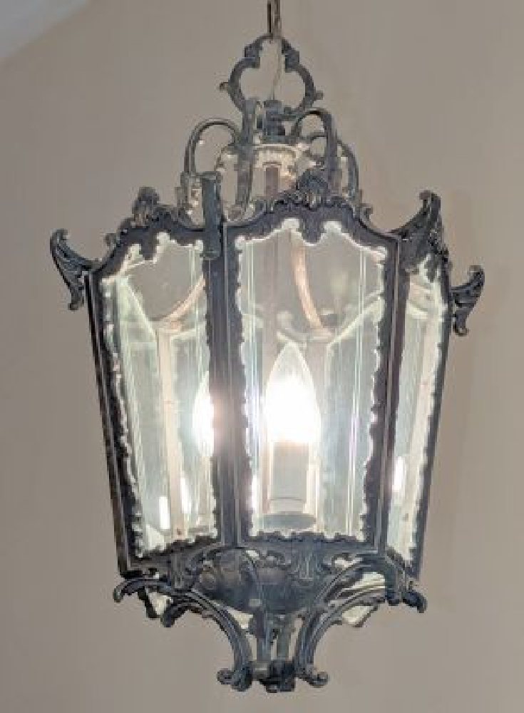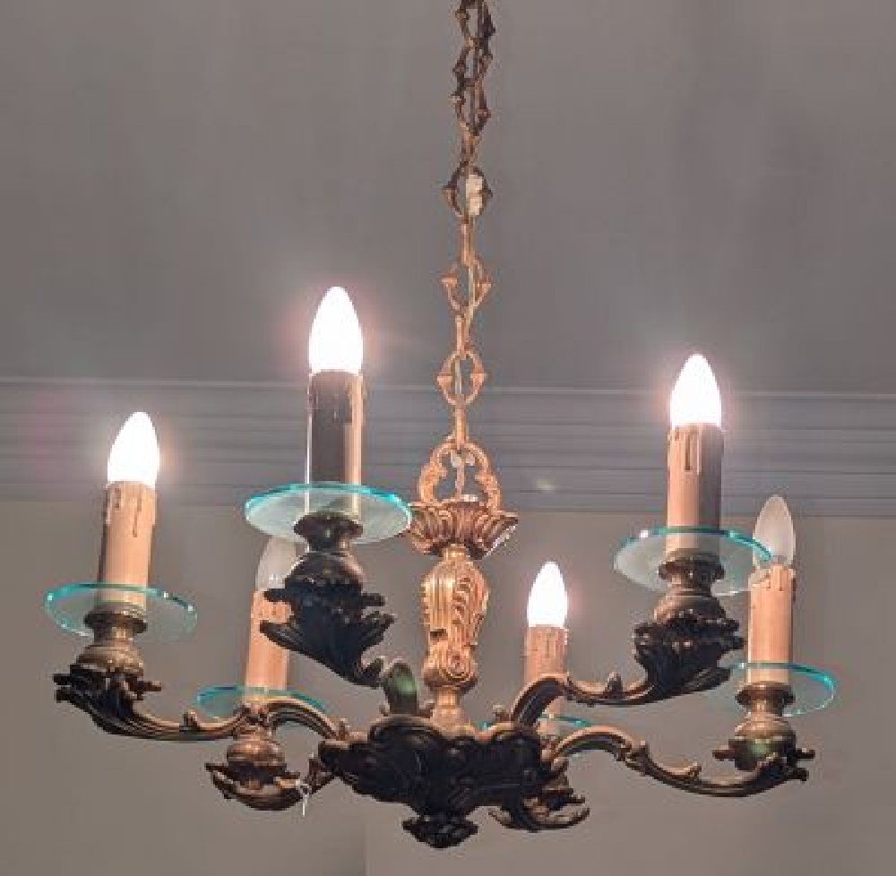 French early 20th C. brass chandelier in the Louis XV style, with crystal curtains and 6 candleholders, 115cm