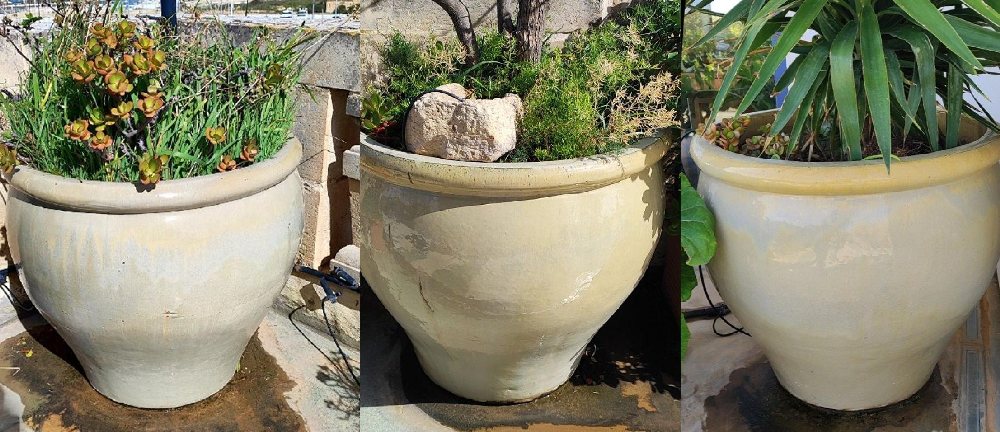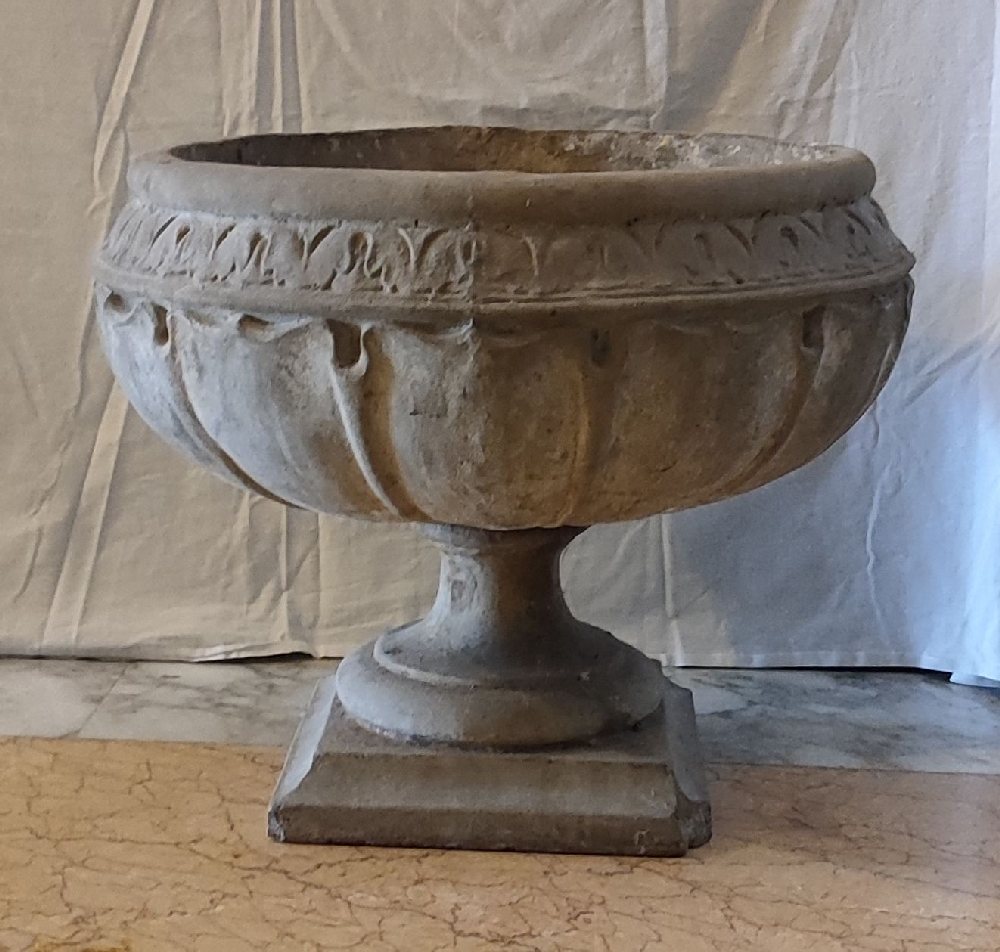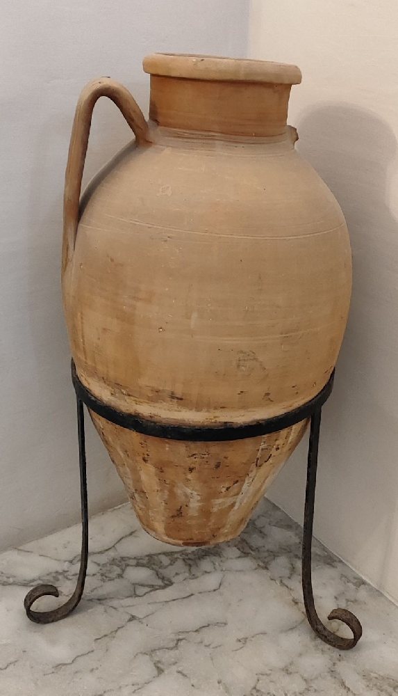 Large terracotta storage jar on iron stand, 88cm (d. )