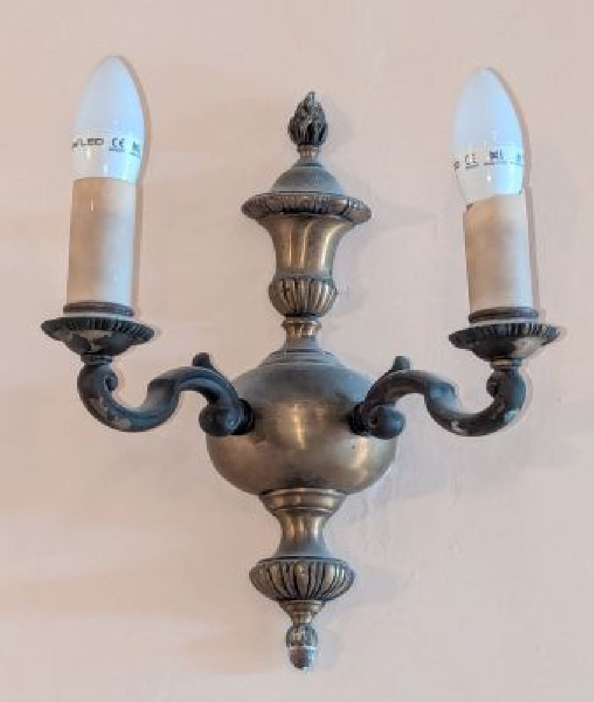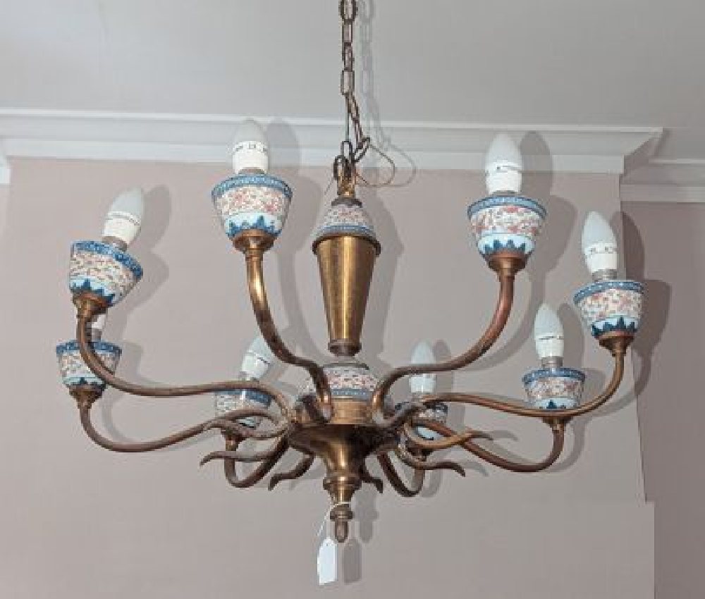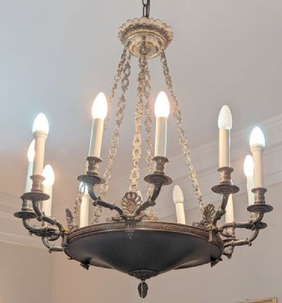 Neo-Classical brass chandelier with 12 candle lights, 82cm, and 4, 2-arm wall lights, 25cm, with shades