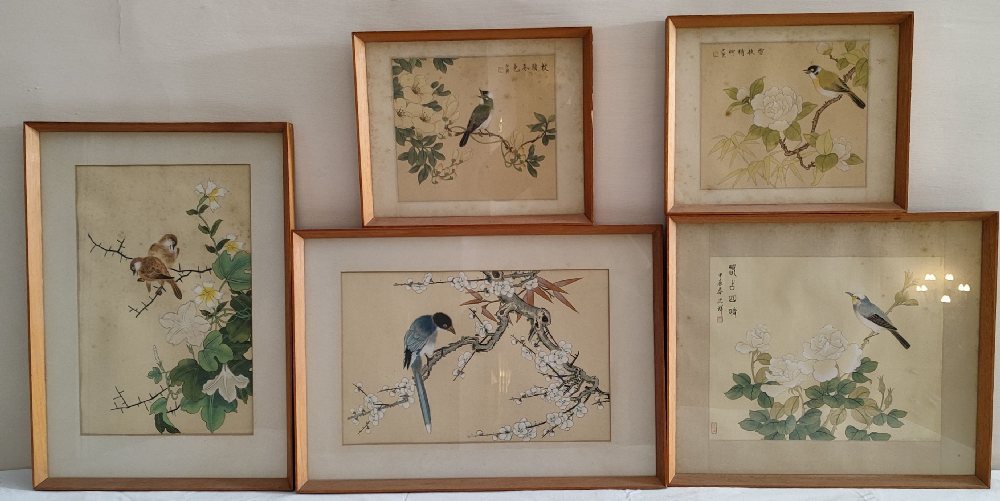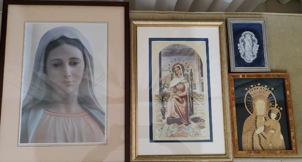 Bamboo collage of the Virgin; Stitched embroidery of the Virgin, and 2 prints