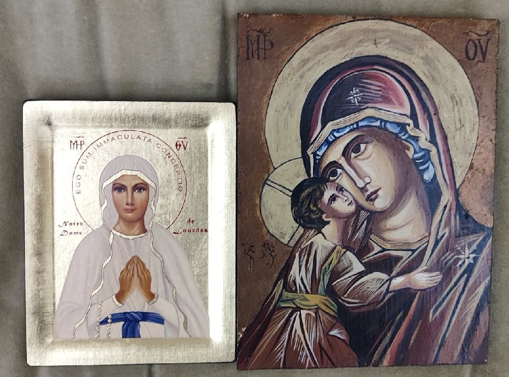 Serigraph icon ‘Our Lady of Lourdes’ 15 x 19cm; Macedonian icon ‘Madonna and Child’ studio of Ainoski Koco, 19 x 26cm