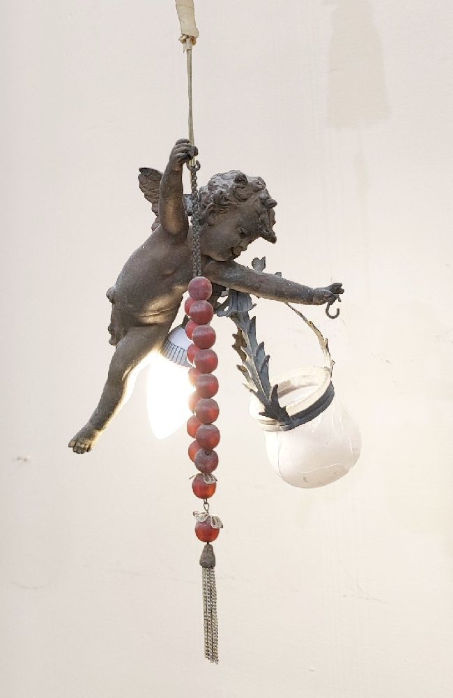 Early 20th C. gilted spelter hanging cherub holding mini font with light fitting