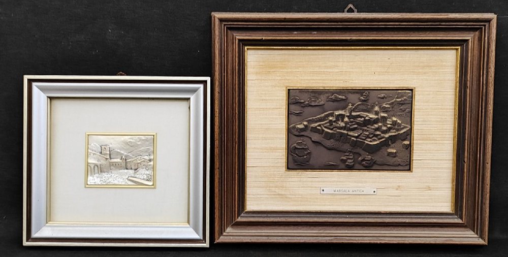 Low relief plaque ‘Marsala Antica’ and framed silvered plaque of a town
