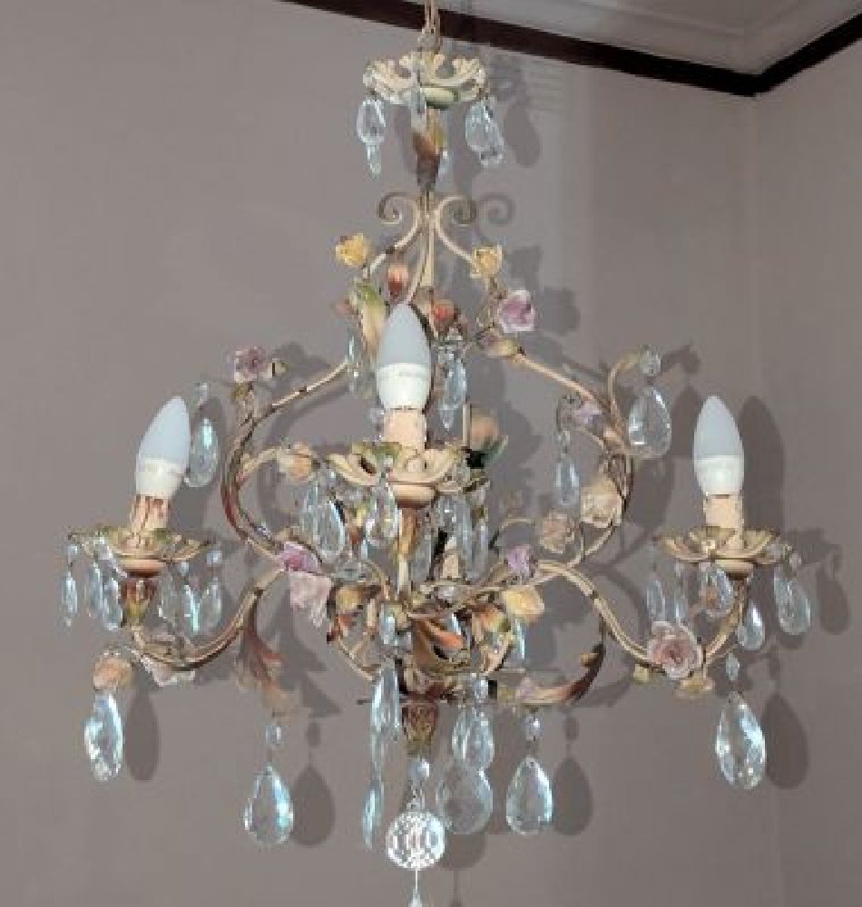 Painted wrought iron chandelier with ceramic flowers and suspended crystals