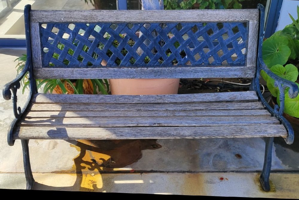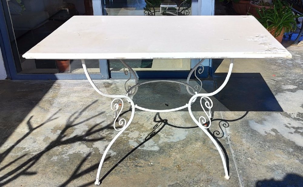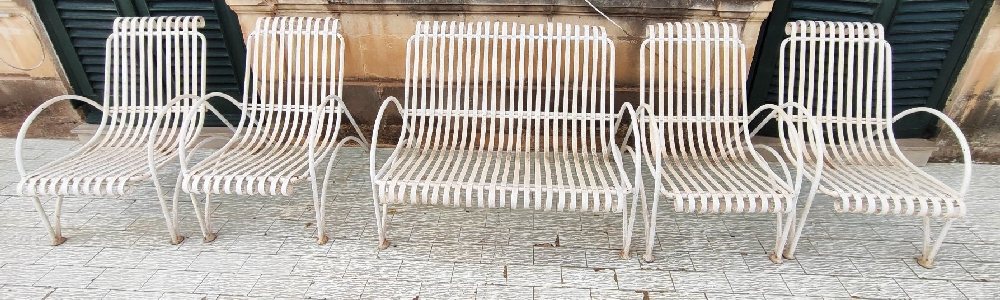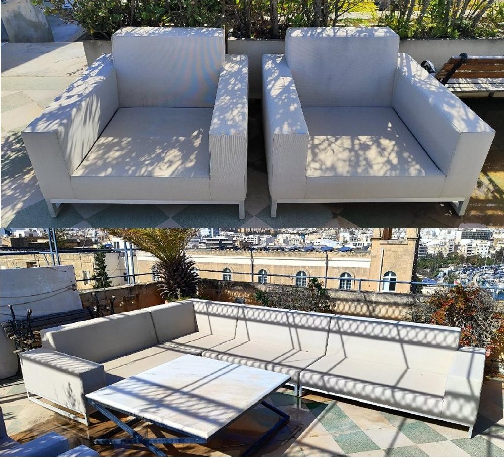 Outdoor L-shade settee, 385 x 255cm, 2 armchairs and iron base table, 120 x 120cm
