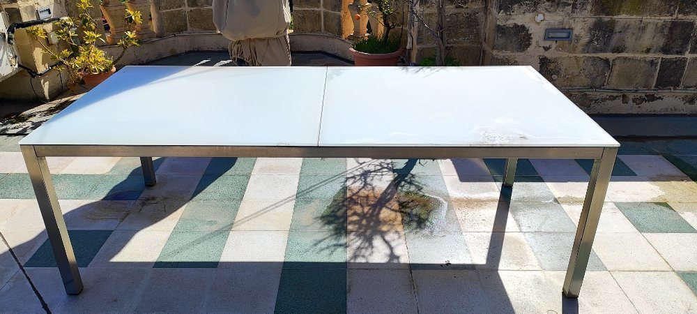 Aluminium table with glass top, 222 x 103cm extendable with 2 extra leaves; and 12 chairs