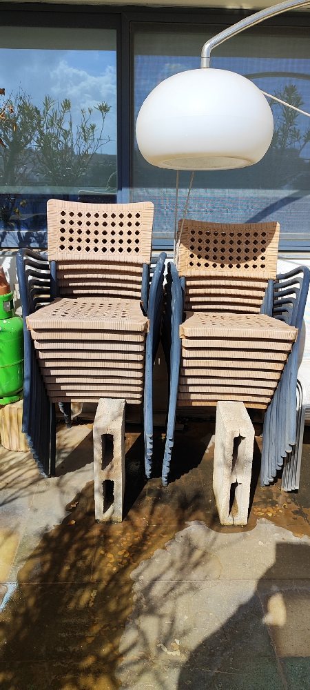 20 Aluminium grey armchairs, stackable, with PVC ratan weave seats and backs