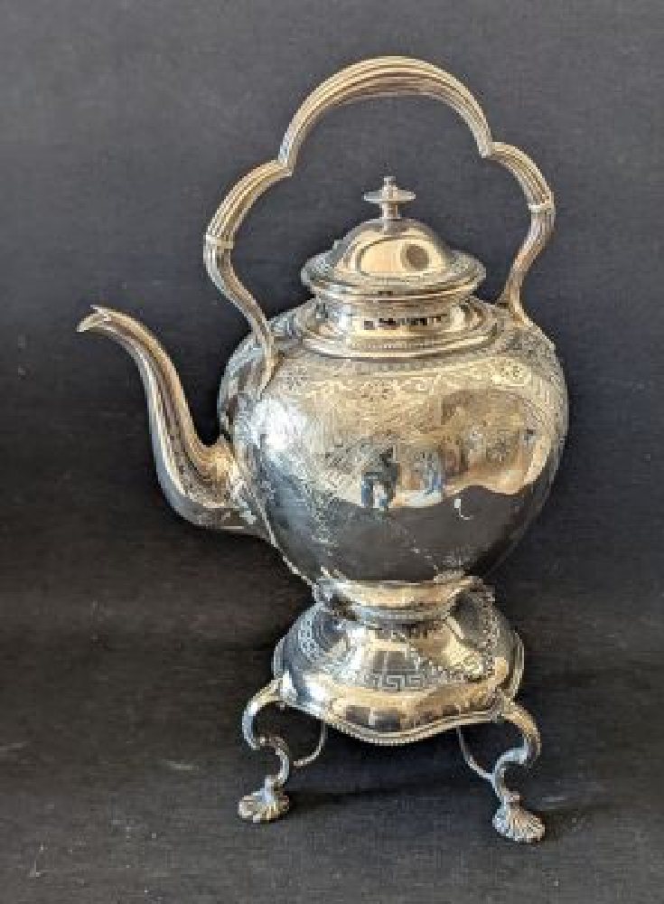 Edwardian silver plated tea kettle on warming stand with engraved decoration