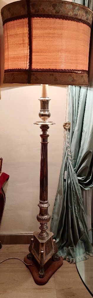 20th C. Large altar candlestick, 140cm, with brass with silvered overlay, with electric fittings and shade, 176cm high