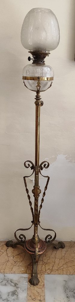 Early 20th C. Brass telescopic standard lamp with fluted crystal reservoir and engraved shade, converted for electricity
