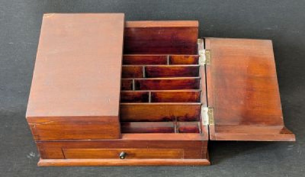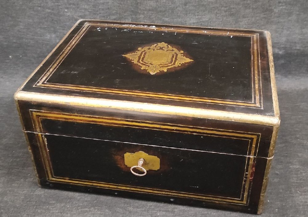 19th C. Walnut and fruit wood inlaid toilette box with brass inlay, the interior fitted as a theatre