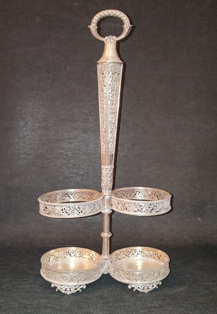 Italian silver 800 double bottle stand with openwork decoration, and beaded ring handle, 41cm