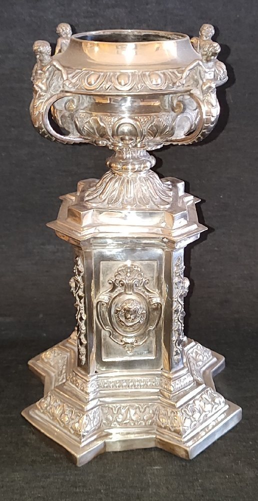 Mid 19th C. Naples silver urn vase with chased decoration and caryatid figures, stepped base, 25cm