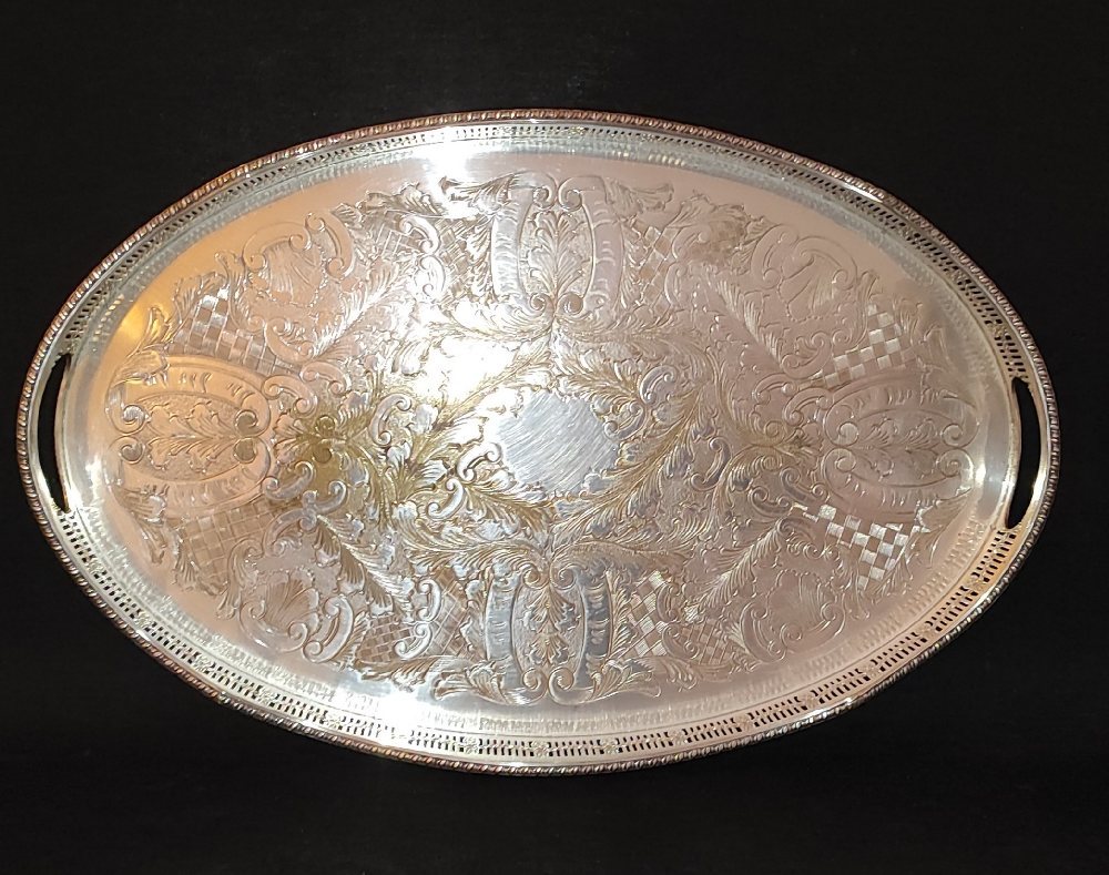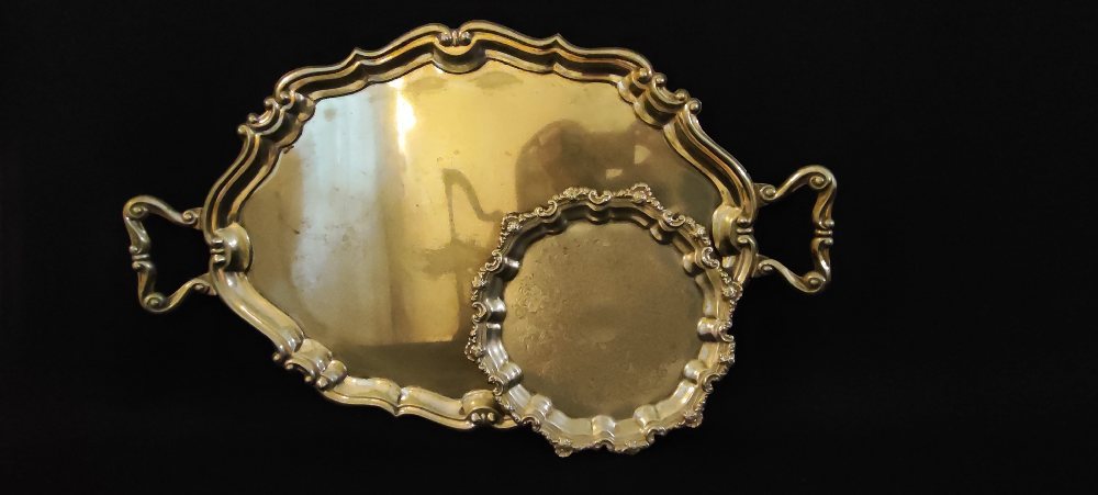 Silver plated oval 2-handled serving tray, 73cm; and a round tray