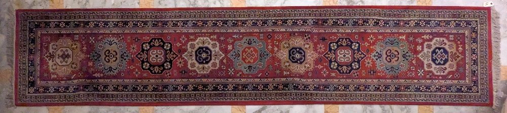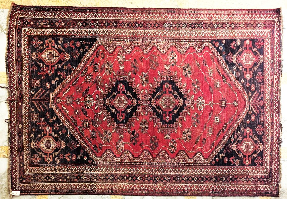 Persian hand woven rug, red ground, single medallion, 220 x 127cm