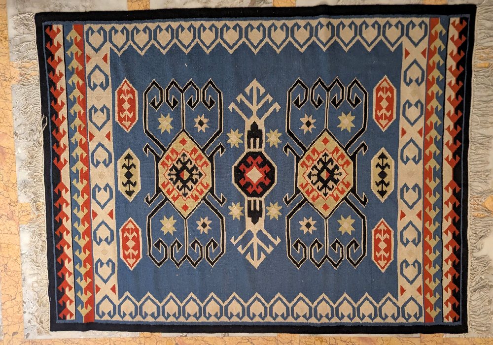 Albanian blue hand woven rug, blue / red/ beige geometric pattern, 200 x 152cm