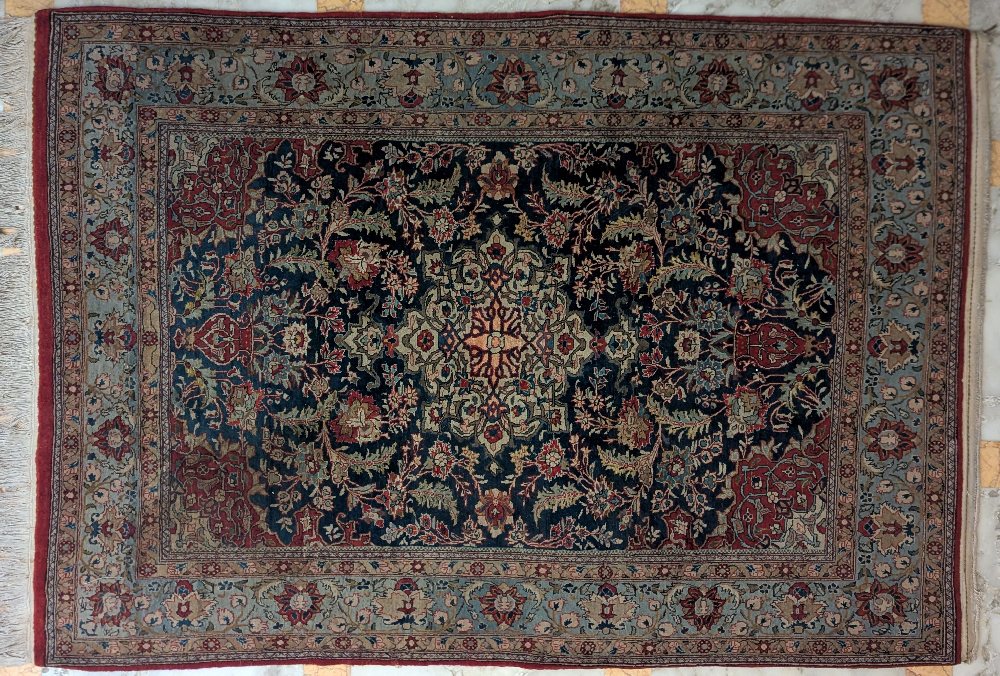 Persian hand woven rug, medallion centre, blue ground, 205 x 145cm