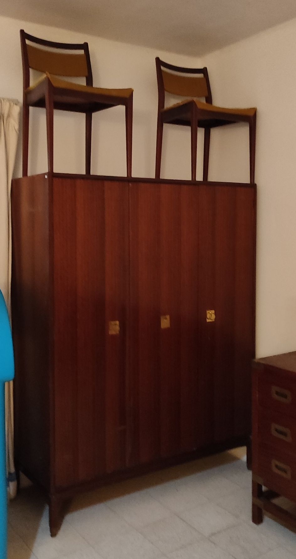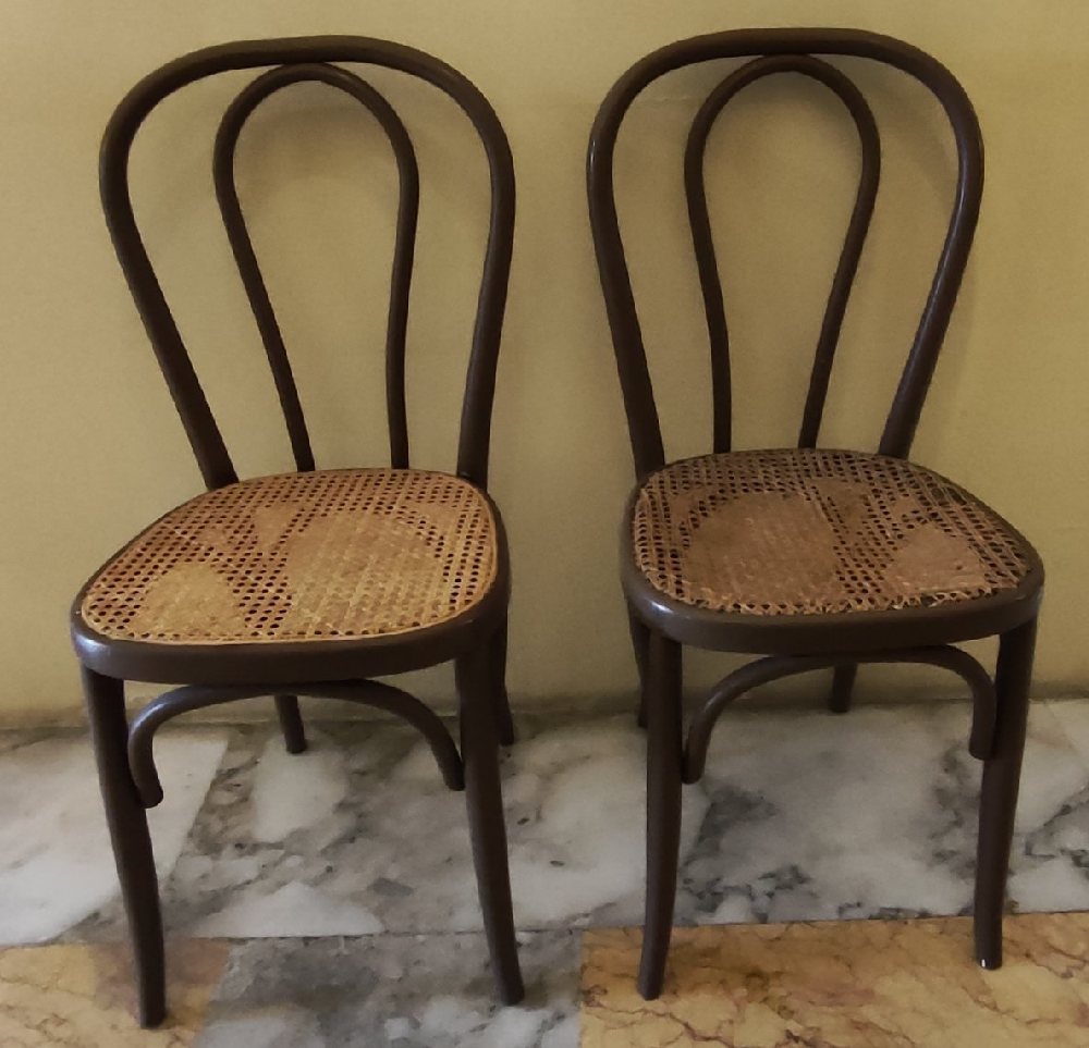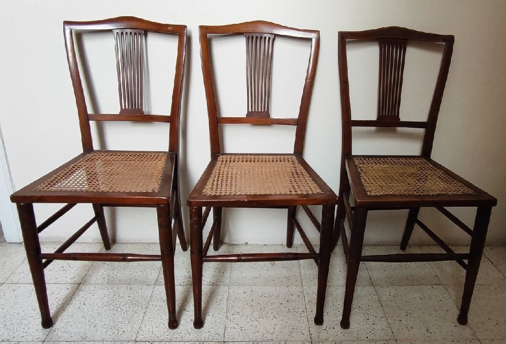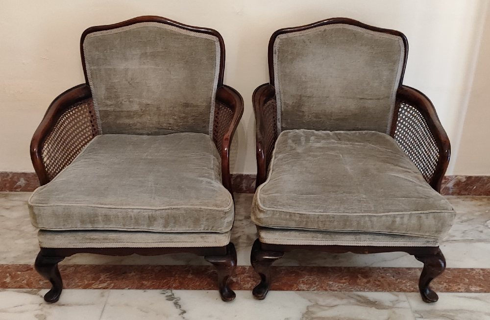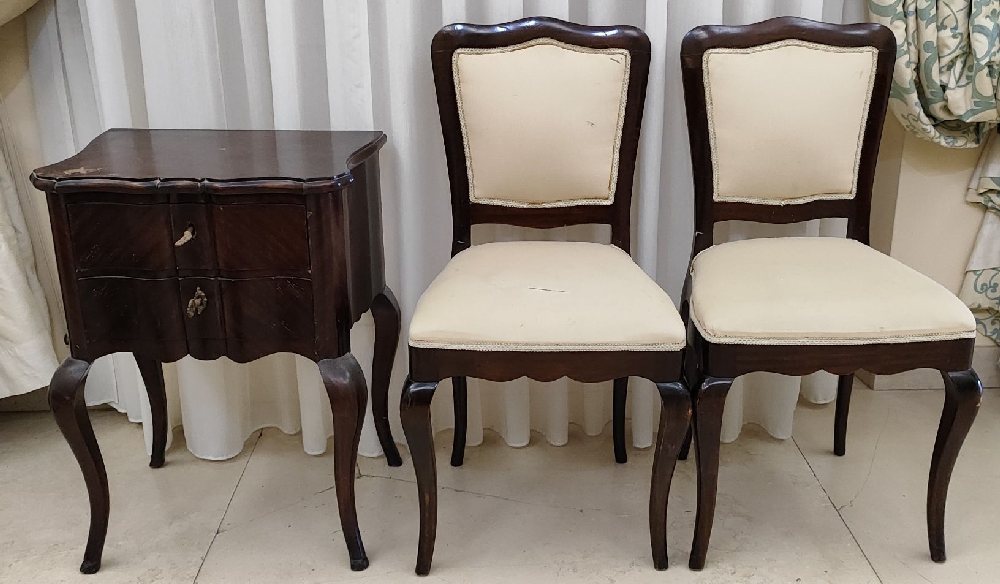 Mahogany bed side table with 2 drawers, on cabriole legs and 2 chairs