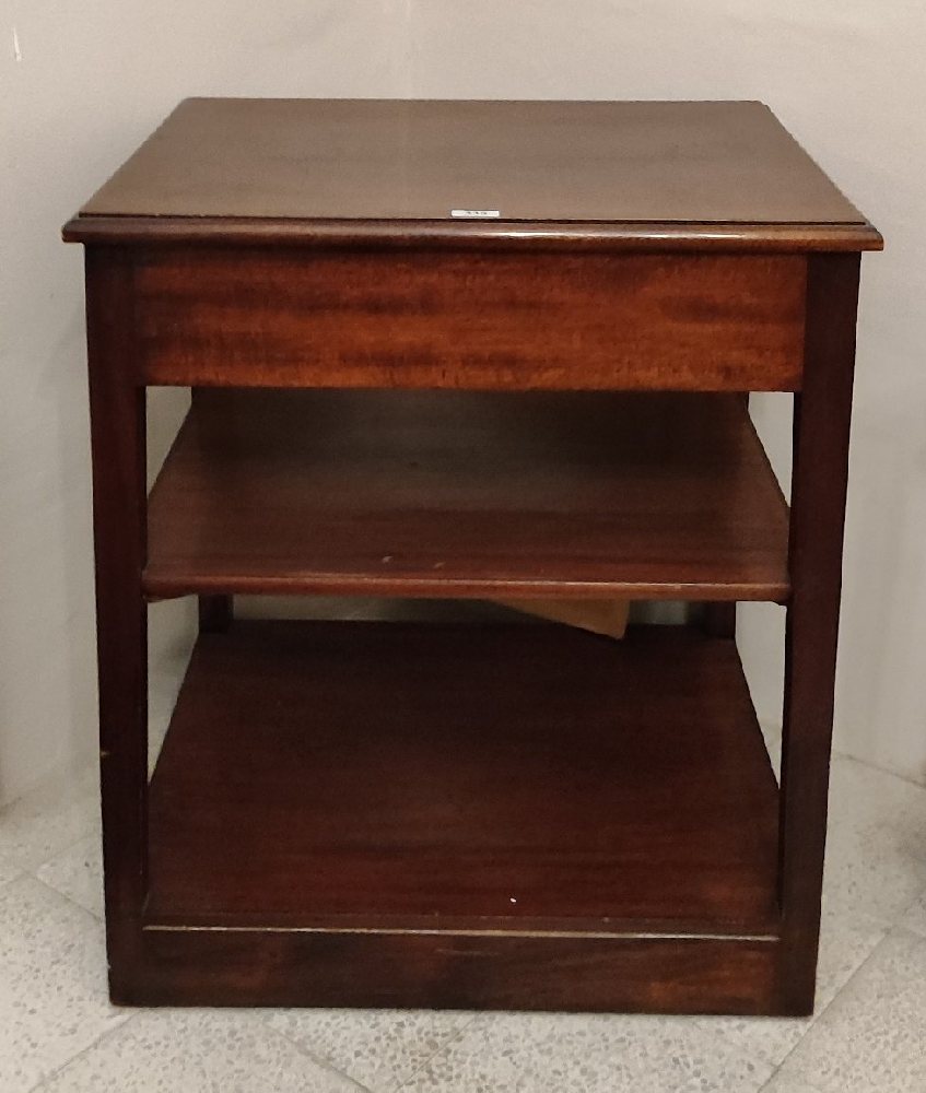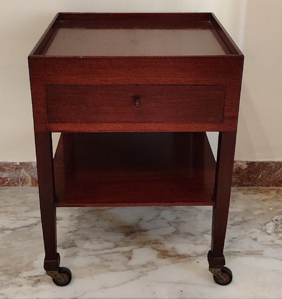 Mahogany square side / lamp table with drawer and under shelf, on castors, 48cm