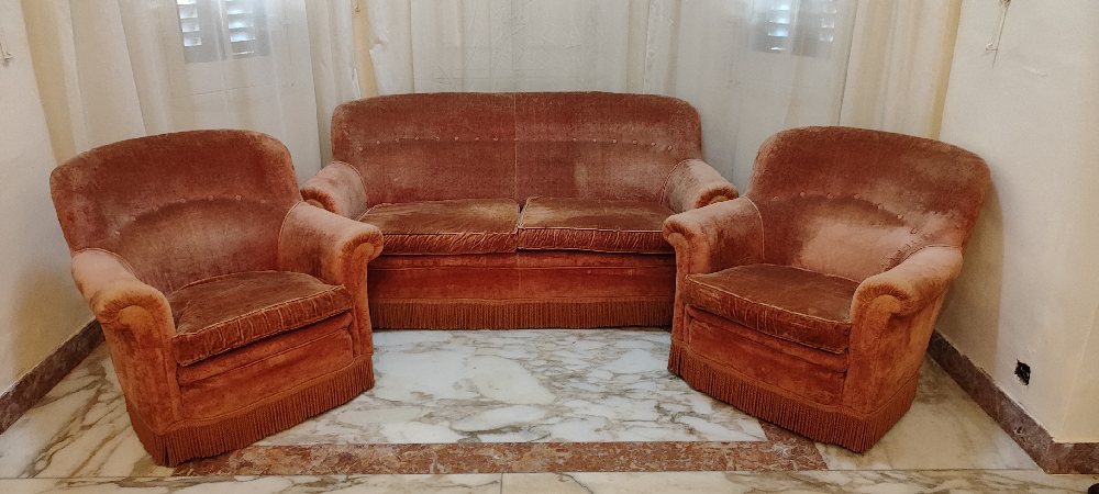 Upholstered 3-seater sofa,220cm and pair armchairs, Chesterfield type