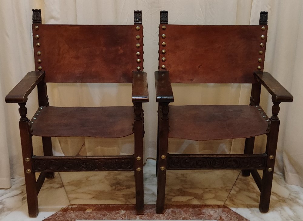 Maltese pair carved wood hall armchairs with leather and brass studs