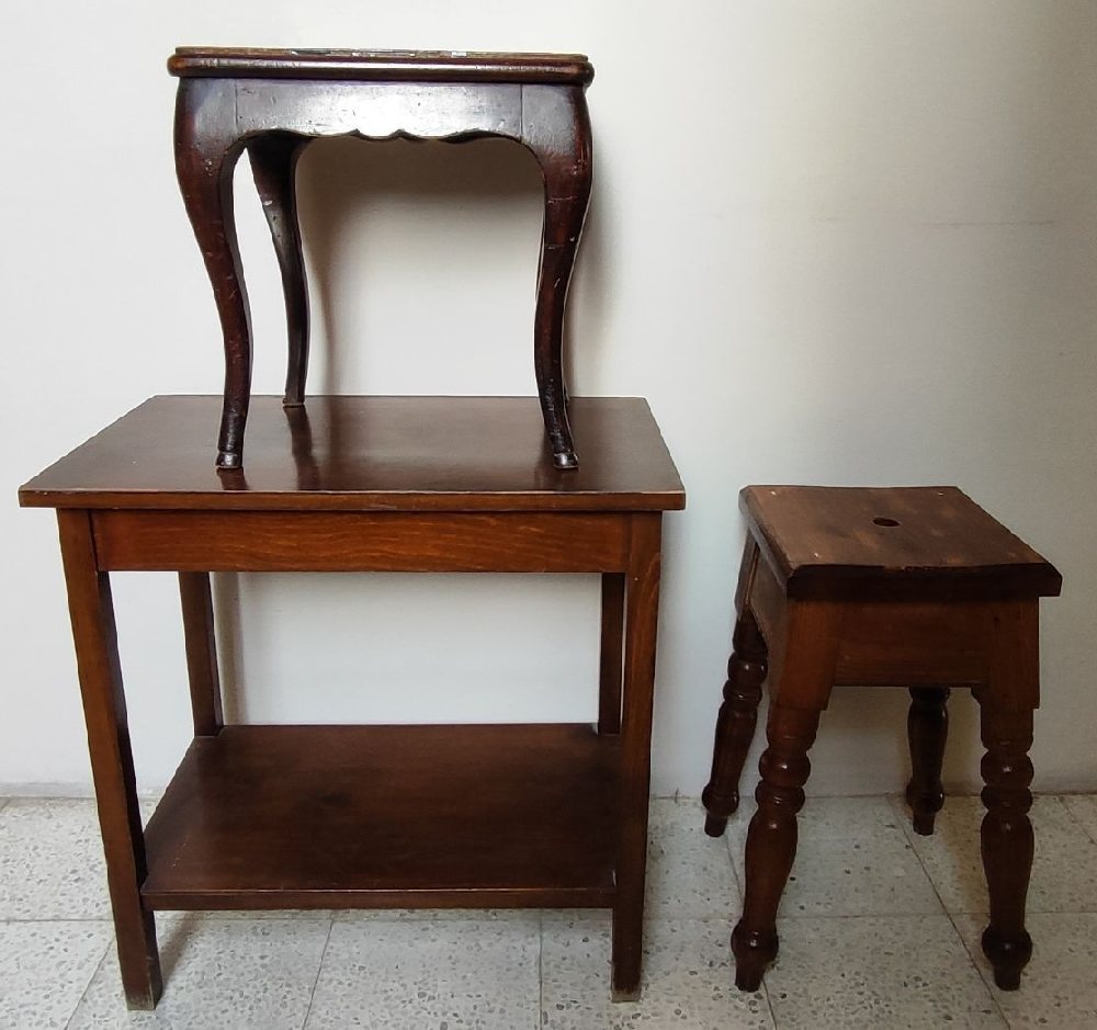 Beech side table with under shelf; red deal stool and small table on cabriole legs