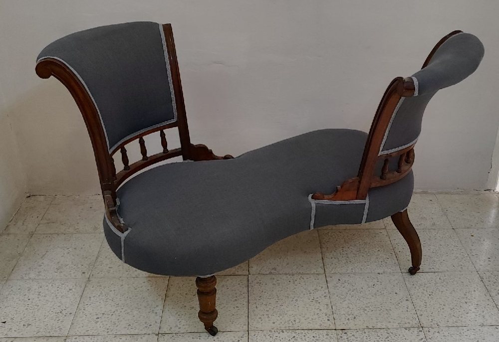 Late 19th C. Walnut tete-a-tete with blue upholstery, 124cm