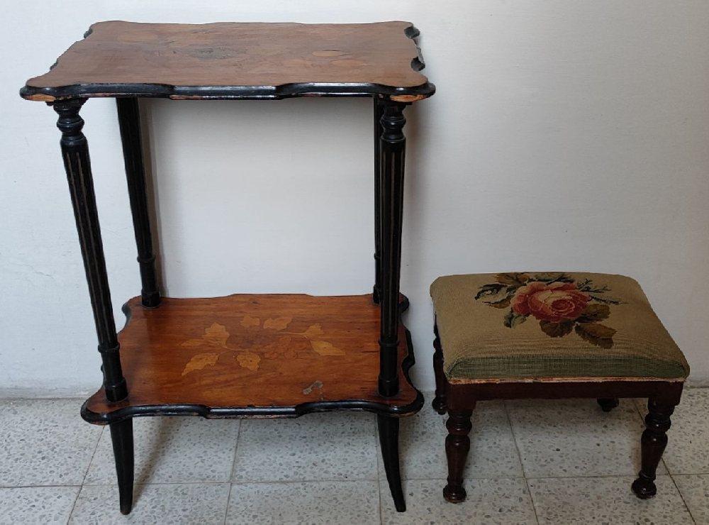 Edwardian inlaid side / lamp table with undershelf, 52cm; and a foot stool with tapestry upholstery
