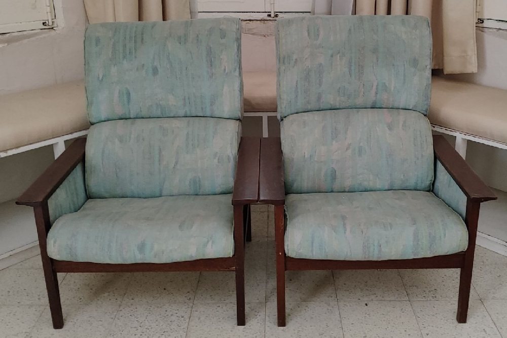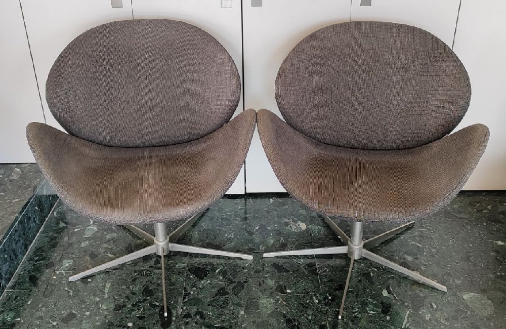 G-Plan 6250 Blofeld swivel pair armchairs, in grey fabric (First launched 1962)