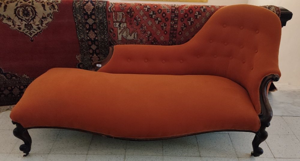 Victorian mahogany chaise lounge on cabriole legs, red fabric upholstery, 180cm