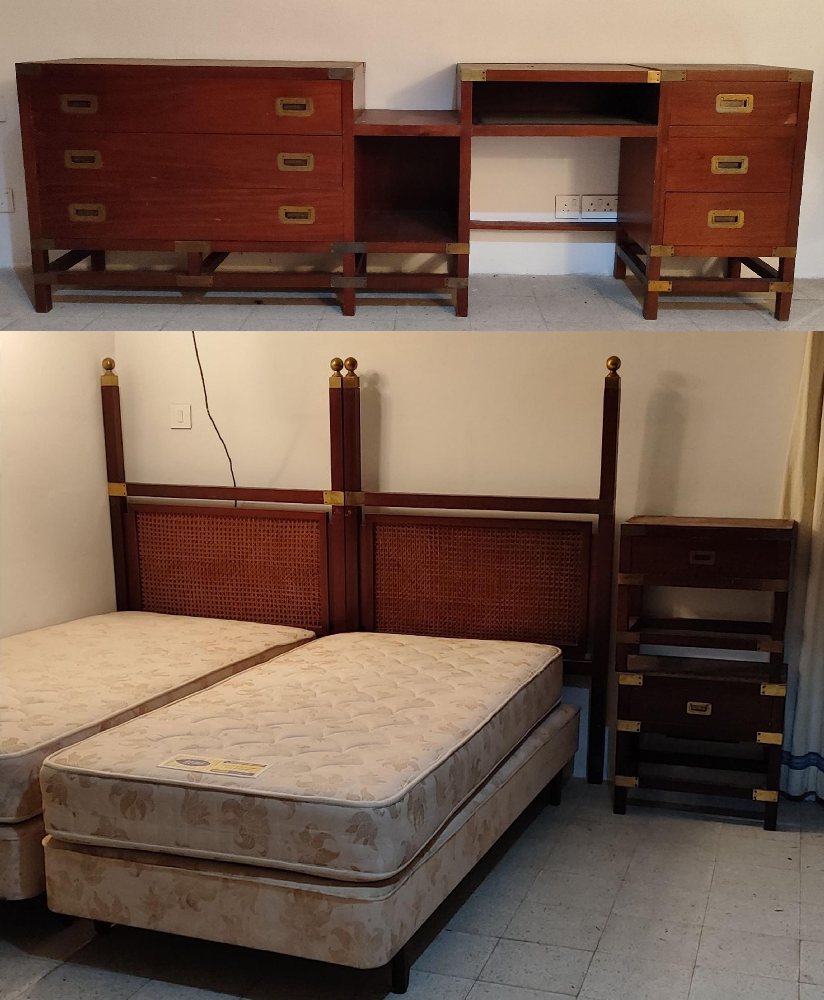 Mahogany and brass banded double chest of drawers, 255cm; 2 single beds, 2 commodes and 2 low tables with brass mounts