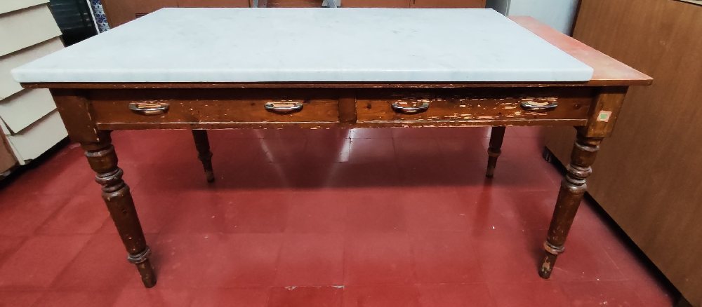 Late 19th C. Maltese pine kitchen table, 74 x 152cm with a white smaller marble top